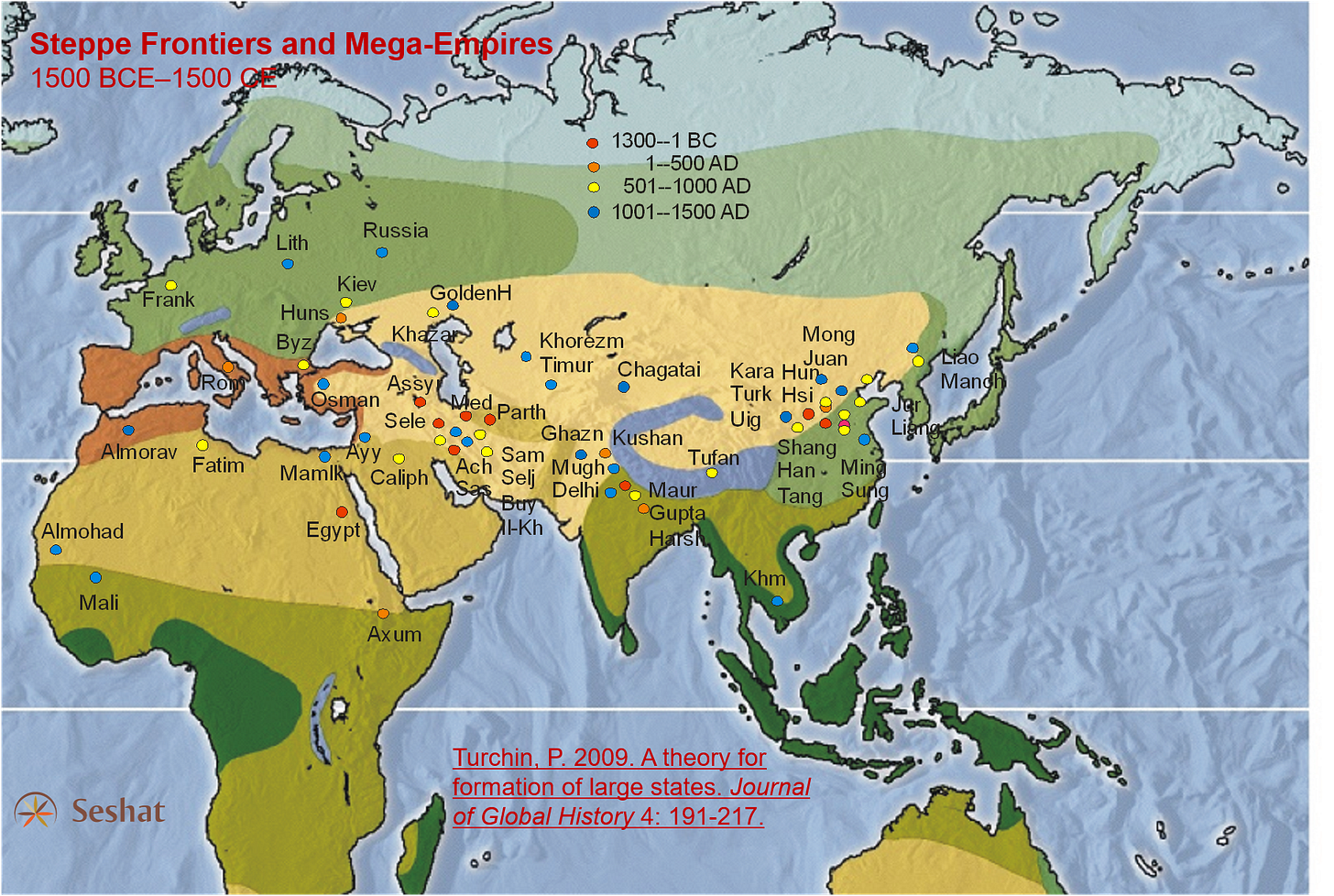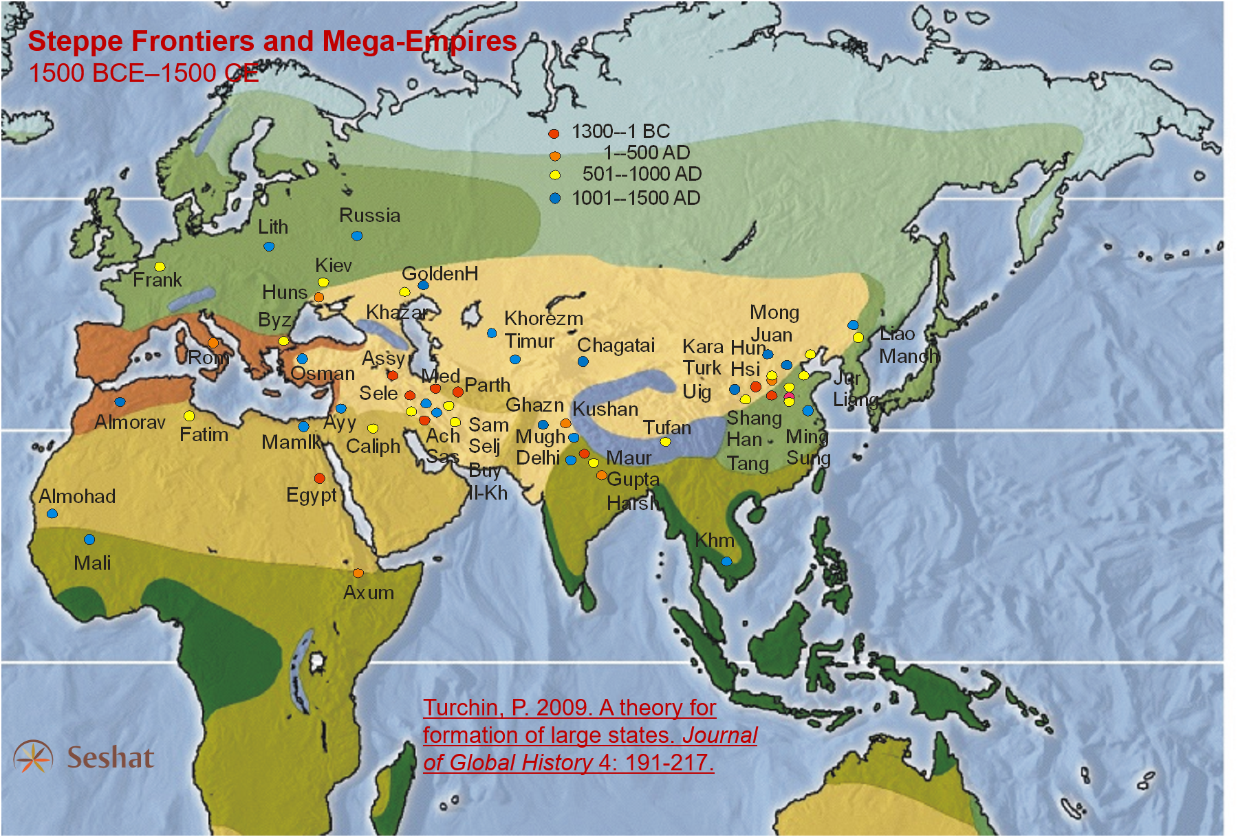 Για να συντομεύσουμε τη μακρά ιστορία, η επανάσταση του σιδερένιου ιππικού μετέτρεψε τη Μεγάλη Ευρασιατική Στέπα σε μια μηχανή ιμπεριογένεσης. Αυτή η ηπειρωτική ενδοχώρα ήταν το σπίτι των νομάδων κτηνοτρόφων, των οποίων η κύρια στρατιωτική δύναμη αποτελούνταν από τοξότες αλόγων. Οι περισσότερες από τις προνεωτερικές μεγα-αυτοκρατορίες βρίσκονταν στις «ακτές» αυτής της «θάλασσας χόρτου» (δείτε το δεύτερο infographic παρακάτω).