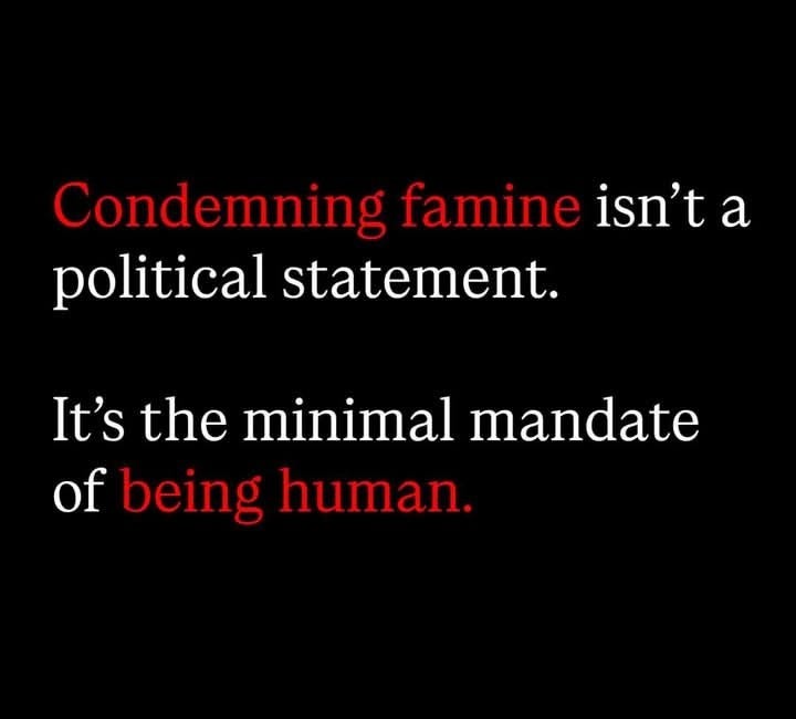 Πέντε άνθρωποι, συμπεριλαμβανομένων τριών παιδιών, πέθαναν από την πείνα τις τελευταίες 24 ώρες, αυξάνοντας το σύνολο σε 127. Χρειάζεται ένα ιδαίτερο είδος βαρβαρότητας να μην επιτρέπεις την είσοδο βρεφικού γάλακτος. Δεν νομίζω ότι έχει υπάρξει κάτι ανάλογο στην ανθρώπινη ιστορία σε τέτοια κλίμακα.