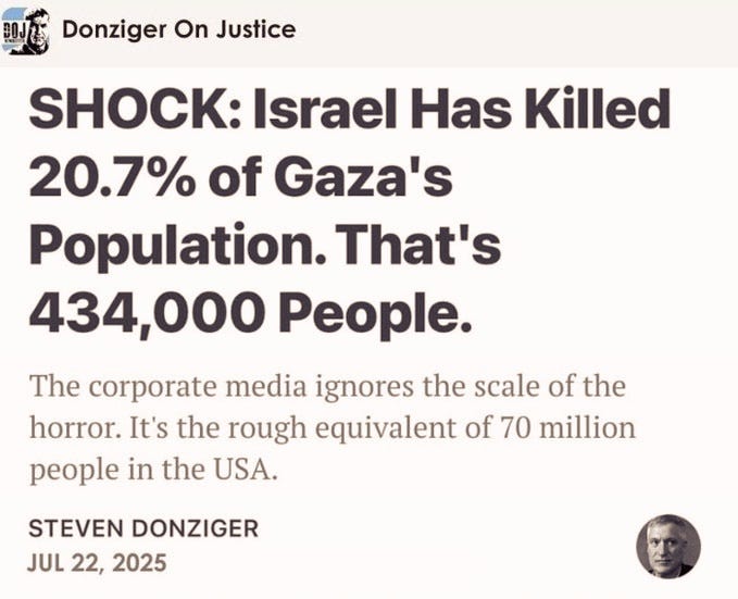 Λένε πως το 20.7% του πληθυσμού της Γάζας έχει σκοτωθεί. Πιστεύω πως όταν τελειώσει η γενοκτονία με την υπόλοιπη εθνοκάθαρση θα φανούν τα πραγματικά νούμερα θανάτων από όλους τους λόγους.