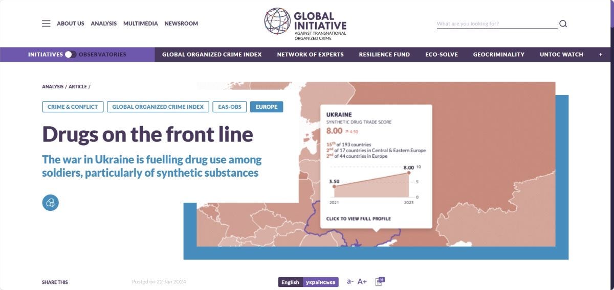 Πέρα από τα στεροειδή, ο παγκόσμιος δείκτης οργανωμένου εγκλήματος του 2023 σημειώνει ότι η αγορά συνθετικών ναρκωτικών της Ουκρανίας έχει σημειώσει τη μεγαλύτερη αύξηση στον κόσμο. Μεταξύ 2021 και 2023, αυξήθηκε κατά 4,50 μονάδες, κυρίως λόγω του πολέμου. Όπως το αλκοόλ, τα ναρκωτικά έχουν γίνει ένα τεράστιο πρόβλημα στις πρώτες γραμμές.