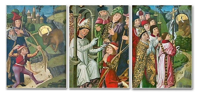 Αυτό έγινε το λάβαρο των ψευδοχριστιανικών πολεμικών λατρειών και καθιερώθηκε εν μέσω του μύθου του 5ου αιώνα για έναν ειδωλολάτρη κυνηγό που απέτυχε να σκοτώσει έναν ταύρο που έτρεξε σε μια ιερή σπηλιά. Όταν ο κυνηγός έριξε το βέλος στη σπηλιά (όπως λέει η ιστορία), εμφανίστηκε μαγικά ο Αρχάγγελος Μιχαήλ και έσωσε τον ταύρο ανακατευθύνοντας το βέλος πίσω στον ειδωλολάτρη κυνηγό... μετατρέποντάς τον μαγικά σε Χριστιανό.