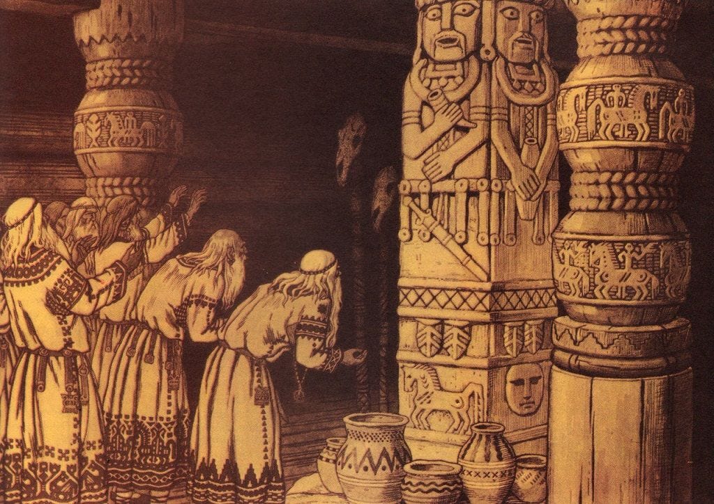 Καλλιτεχνική απόδοση του εσωτερικού του ναού του Svantevit στην Arkona