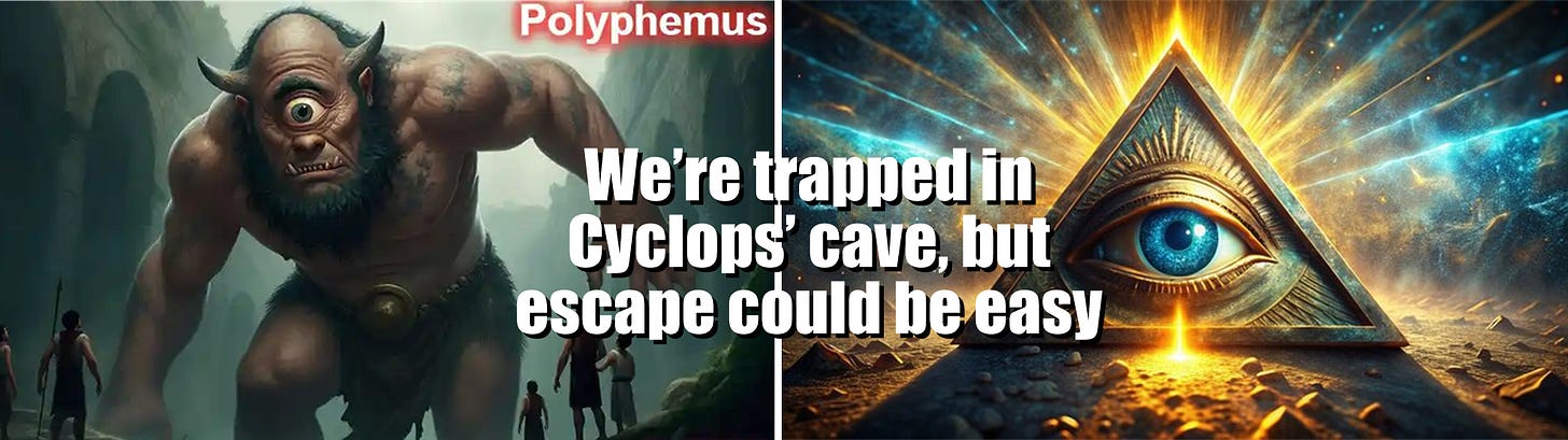 Όπως ο Οδυσσέας και οι άντρες του, έτσι και εμείς είμαστε παγιδευμένοι στη σπηλιά του μονόφθαλμου τέρατος. Αλλά είμαστε παγιδευμένοι εκεί με τη δική μας συναίνεση και η απόδραση από αυτή τη σπηλιά θα μπορούσε να είναι τόσο εύκολη όσο η ανάκληση της συγκατάθεσής μας. Για ένα άτομο ή ένα νοικοκυριό, το πρώτο βήμα θα πρέπει να είναι η ανάληψη όσο το δυνατόν περισσότερων χρημάτων από το τραπεζικό σύστημα και η μετατροπή τους σε περιουσιακά στοιχεία που μπορούμε να ελέγξουμε μόνοι μας.