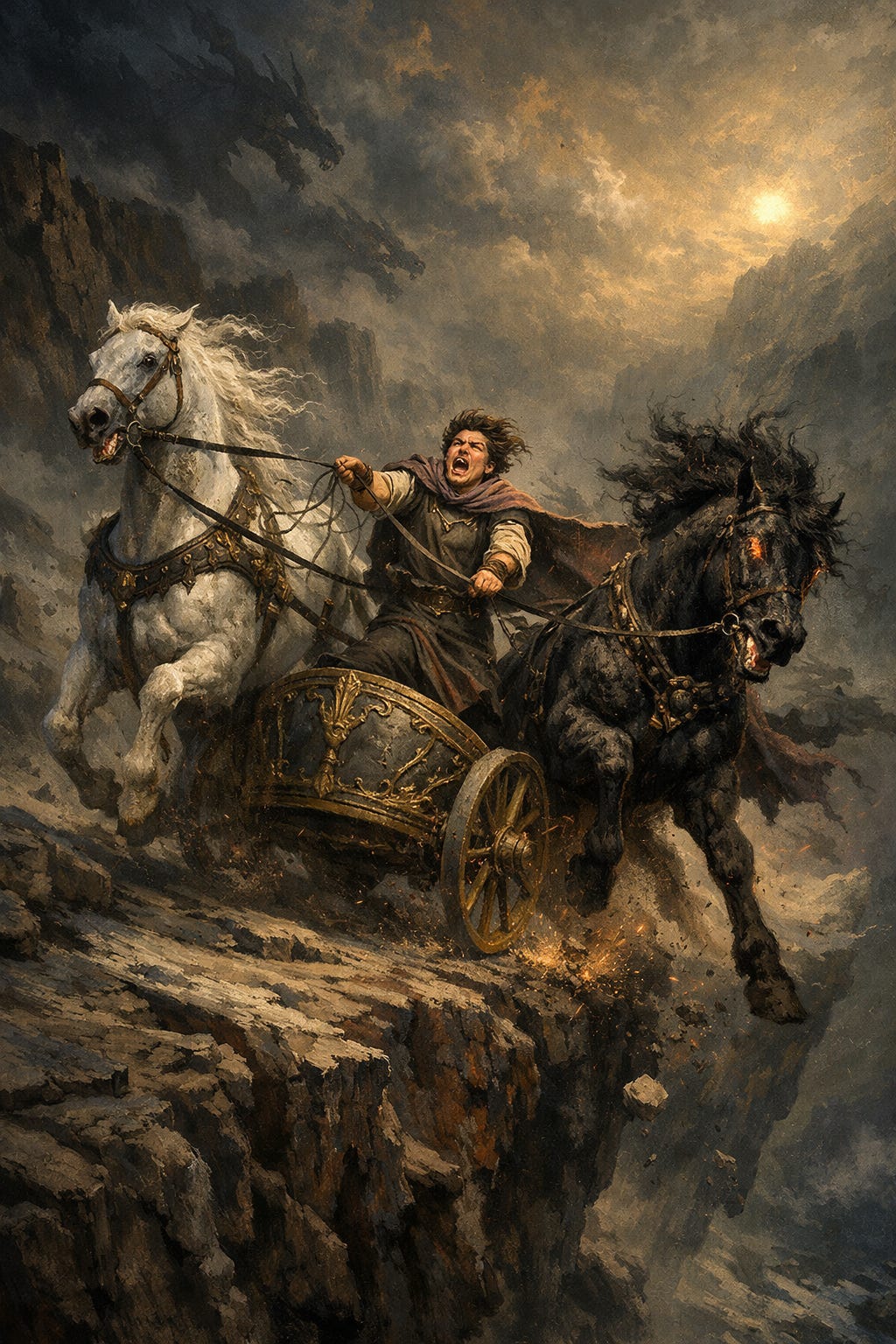 Η πονηρία εδώ δεν σημαίνει απλώς βλάβη. Σημαίνει διαστροφή: τη σκόπιμη αντιστροφή της μορφής, την απόλαυση της μόλυνσης ως τέτοιας. Αυτό μας επιστρέφει σε μια κεντρική πλατωνική ενόραση. Το κακό δεν είναι απλώς η απουσία του καλού, αλλά μια κακή σχέση με αυτό. Στον Φαίδρο, ο Πλάτωνας περιγράφει την ψυχή ως ένα άρμα που το σέρνουν δύο άλογα, ένα ευγενές, ένα βασικό. Το καθήκον της λογικής δεν είναι να καταστρέψει το σκοτεινό άλογο, αλλά να το κυβερνήσει. Όταν η λογική παραιτείται, η επιθυμία δεν γίνεται κακή από μόνη της· γίνεται καταστροφική μέσω της υπερβολής. Η αποτυχία δεν είναι επιθυμία, αλλά έλλειψη μέτρου. Γι' αυτό ο Πλωτίνος επιμένει ότι το σώμα και τα πάθη δεν είναι κακά. Γίνονται κακοί μόνο όταν κυριαρχούν σε αυτό που θα έπρεπε να τους κυβερνά. Ο δράκος, με αυτή την έννοια, δεν είναι ύλη, είναι ύλη αδιαμόρφωτη. Είναι hyle απελευθερωμένο προς τα κάτω και όχι ανυψωμένο προς τα πάνω, καθώς ο Evola το διατυπώνει αυτό με χαρακτηριστική σαφήνεια: