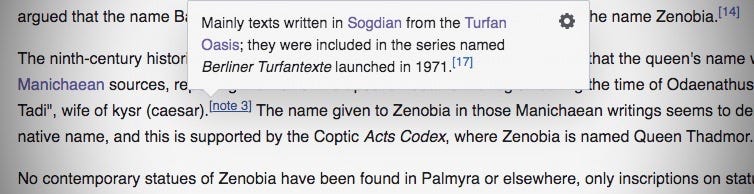 Σε μια επιμελώς δαιδαλώδη σύνδεση μεταξύ γλωσσών και τόπων, ταιριάζει απόλυτα καθώς η Ζηνοβία ονομαζόταν «Βασίλισσα Tadi» στις μανιχαϊστικές πηγές που χρονολογούνται γύρω στο 263-267, γραμμένες στα σογδιανό, από την όαση Turfan - ένα σημαντικό εμπορικό κέντρο κατά μήκος του δρόμου του μεταξιού.
