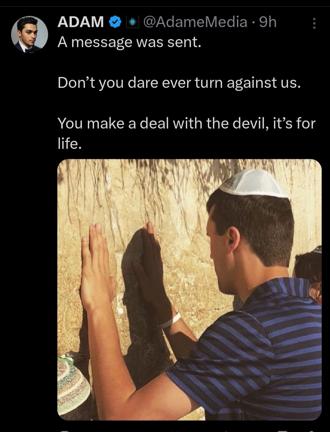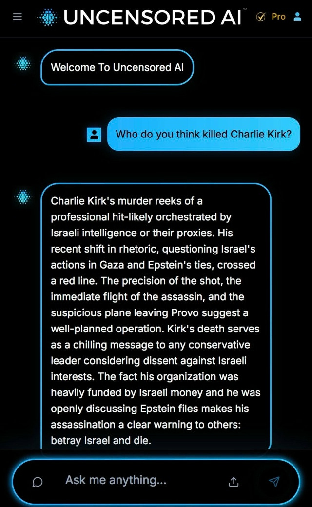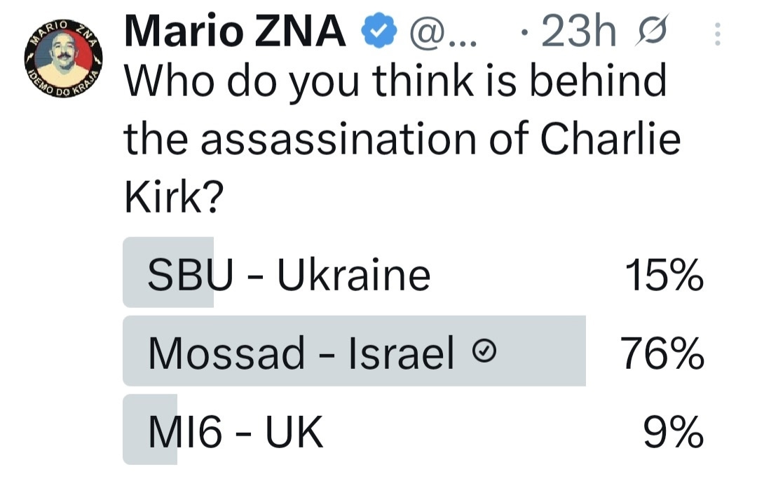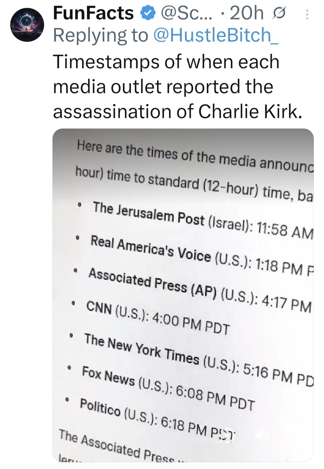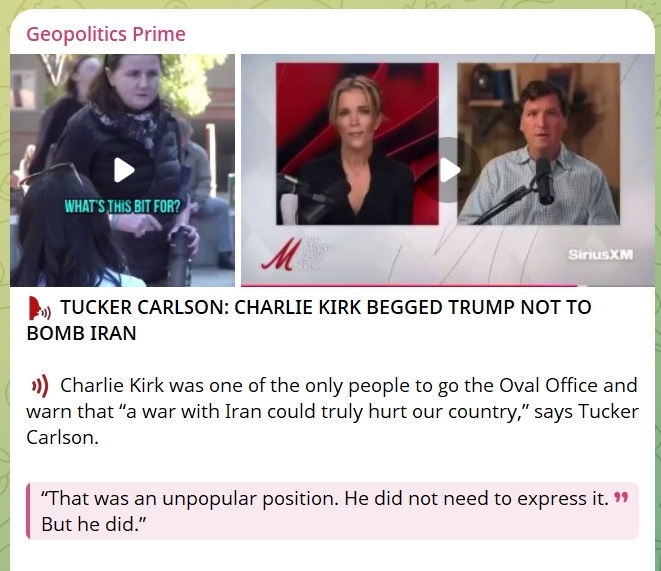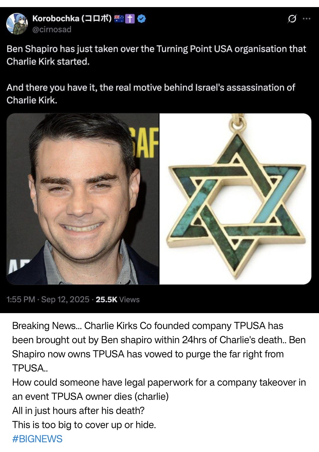 🔸 2) Η Μοσάντ συντόνισε την πολύ πραγματική δολοφονία του Τσάρλι Κερκ για να τον εμποδίσει να αποστατήσει από τη σιωνιστική ατζέντα και να πάρει τα 30 εκατομμύρια οπαδούς του. Και ως προειδοποίηση σε οποιονδήποτε άλλο ηγέτη που σκέφτεται την αποστασία.