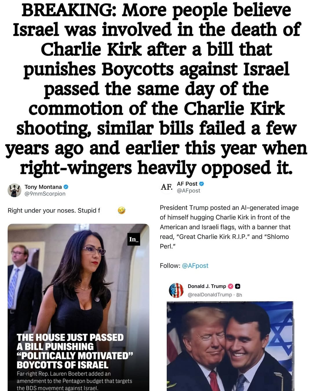 Έχω την αίσθηση ότι, αφού πολλοί εικάζουν την εμπλοκή του Ισραήλ στο θάνατο του Τσάρλι Κερκ, τους επόμενους μήνες αυτοί οι νομοθέτες θα προωθήσουν νόμους ειδικά για το Ισραήλ.