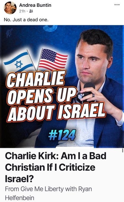 🔴 Ο Kirk δεν απέφυγε να συζητήσει τους ύποπτους δεσμούς της Μοσάντ με τον παιδόφιλο Jeffrey Epstein και απαίτησε από το DOJ να αποσφραγίσει τα αρχεία Epstein. Αυτό σίγουρα θα ενόχλησε και τον Τραμπ.