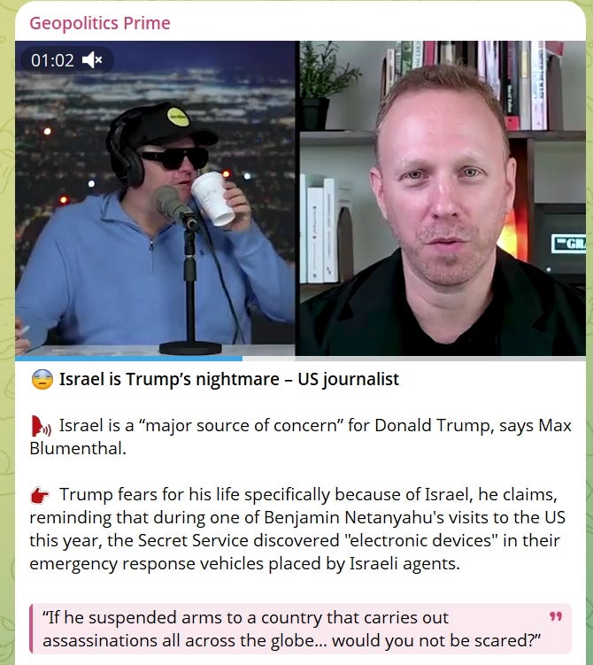 Από εσωτερικές πληροφορίες που έχει ο Μαξ Μπλουμεντάλ υποστηρίζει πως ο Τραμπ φοβάται πολύ για την ζωή του από τον Νετανιάχου. Σε πρόσφατη επίσκεψη βρήκε ηλεκτρονικές συσκευές στα αυτοκίνητα άμεσης δράσης του Τραμπ. Η ιστορία των βομβητών που σκότωσαν την ηγεσία της Χεζμπολάχ βαράει καμπανάκια.