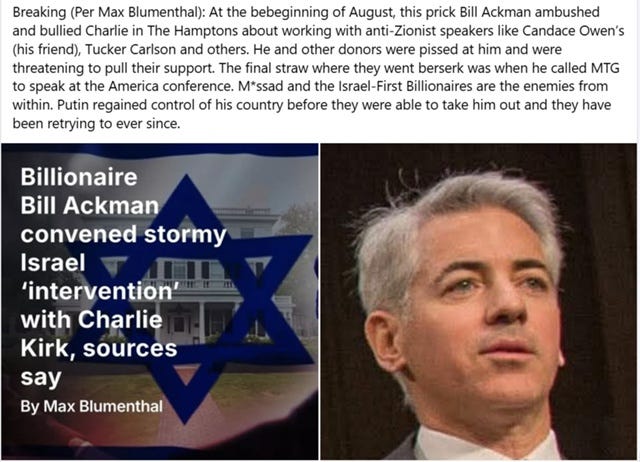 Ο δισεκατομμυριούχος Bill Ackman σφυρικόπησε τον Charlie Kirk για την άρνησή του να υποστηρίξει τη γενοκτονία στη Γάζα. Αν συνέχιζε να το κάνει, θα έχανε όλο το κοινό του. Οι νέοι Αμερικανοί έχουν στραφεί σταδιακά κατά του Ισραήλ και το Κλέρ έπρεπε να προσαρμοστεί.