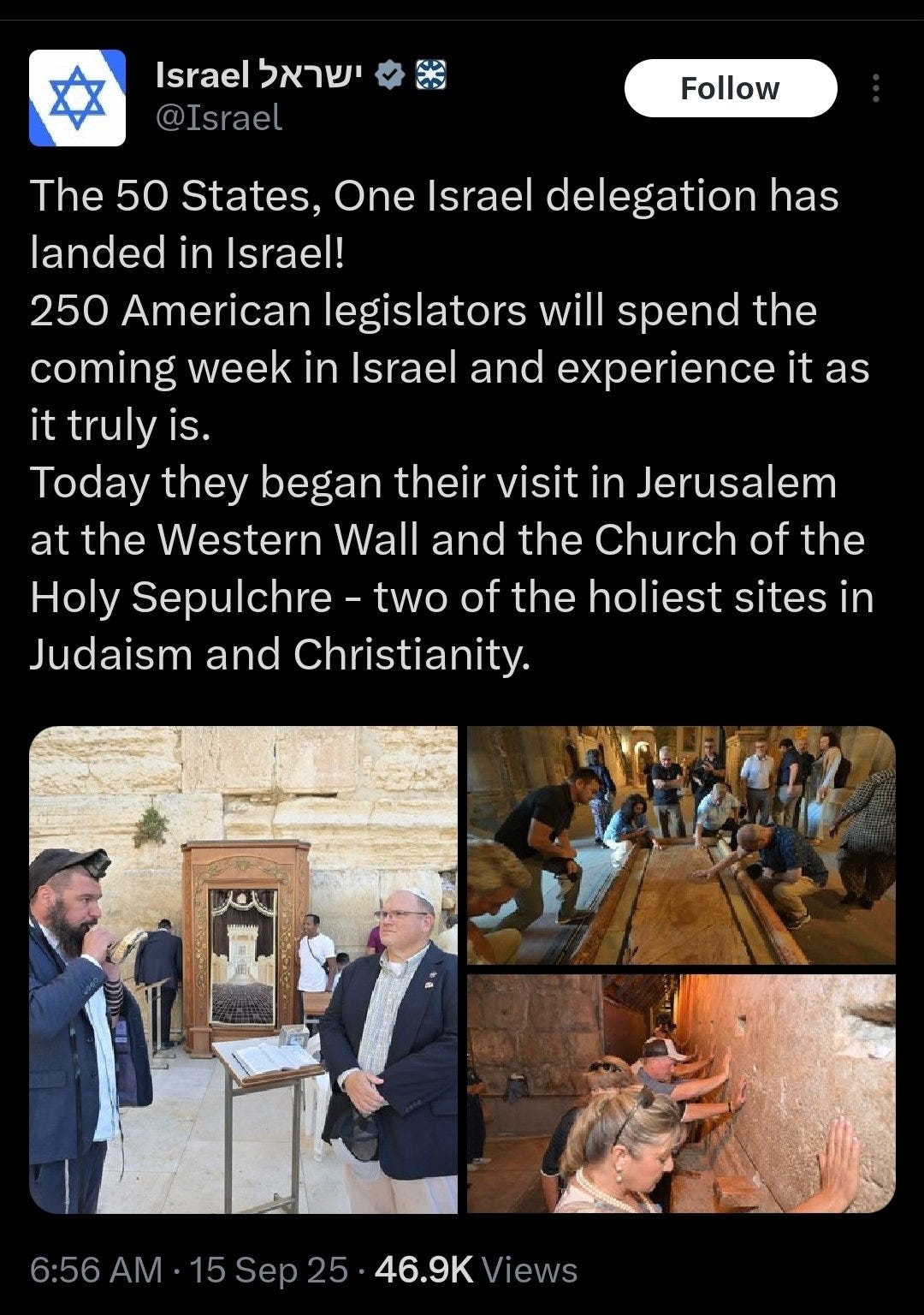 Στο μεταξύ μαζεύτηκαν στο “ισραήλ” 250 Αμερικανοί πολιτικοί. Ενώ οι περισσότεροι Αμερικανοί θρηνούν την απώλεια του Τσάρλι Κερκ, πάνω από 250 διακομματικοί πολιτειακοί νομοθέτες των ΗΠΑ που εκπροσωπούν και τις 50 πολιτείες - συγκεκριμένα, πέντε από κάθε πολιτεία - βρίσκονται αυτή τη στιγμή στο Ισραήλ...