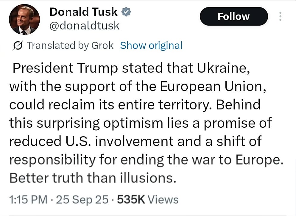 Αυτό για το οποίο καίγονται οι Ευρωπαίοι είναι να μην φύγει η Αμερική και ας πληρώνουν το οπλοστάσιο με 10% καπέλο, ειδικής μεταχείρισης. Το μήνυμα του Τραμπ που έλεγε ότι η Ρωσία είναι “χάρτινος τίγρης” και ότι νικά η Ουκρανία φαίνεται πως δεν έπεισε τους Ευρωπαίους που είδαν πίσω από το μήνυμα την νύξη ότι μπορούν να τα καταφέρουν και μόνοι τους οι Ευρωπαίοι.
