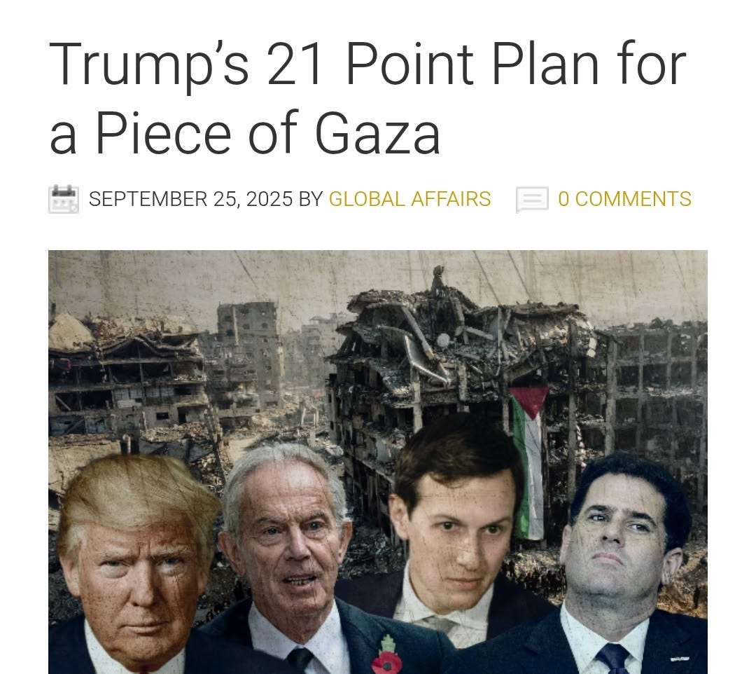 Στις 28 Αυγούστου 2025, το Axios ανέφερε μια συνάντηση στην οποία συμμετείχαν ο Trump, ο Tony Blair, ο Jared Kushner και ο Ισραηλινός αξιωματούχος Ron Dermer, η οποία επικεντρώθηκε σε μια μεταπολεμική στρατηγική για τη Γάζα. Εκείνη την εποχή, η συνάντηση στον Λευκό Οίκο δεν απέφερε οριστικά αποτελέσματα, αλλά τόνισε την παρατεταμένη αβεβαιότητα σχετικά με το ποιος θα μπορούσε να αναλάβει τον έλεγχο της Γάζας μετά τη Χαμάς. Έκτοτε, ο ΟΗΕ ανακοίνωσε λιμό στη Γάζα και υπάρχει συναίνεση μεταξύ των πλέον σεβαστών διεθνών ανθρωπιστικών οργανώσεων ότι το Ισραήλ διαπράττει γενοκτονία στη Γάζα. Σήμερα, το Axios ανέφερε ότι στο περιθώριο της Γενικής Συνέλευσης των Ηνωμένων Εθνών στη Νέα Υόρκη, ο πρόεδρος Τραμπ και ο απεσταλμένος του Λευκού Οίκου Στιβ Γουίτκοφ παρουσίασαν στους Άραβες και μουσουλμάνους ηγέτες ένα «σχέδιο 21 σημείων για την ειρήνη στη Μέση Ανατολή στη Γάζα», το οποίο προφανώς αποσκοπεί στην επίλυση της σύγκρουσης στη Γάζα.