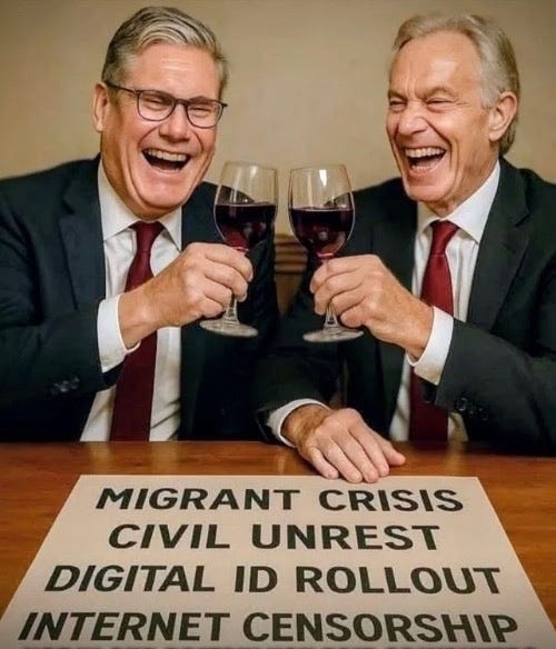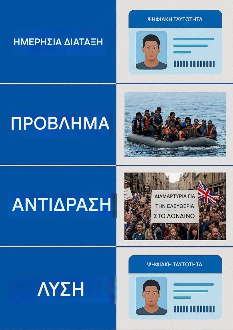 Ο Πρωθυπουργός πιέζει για υποχρεωτική Ψηφιακή Ταυτότητα για όλους τους ενήλικες - ένα Οργουελικό σύστημα που πλαισιώνεται ως λύση για την παράνομη μετανάστευση. Το πρόγραμμα απαιτεί από τους πολίτες να επαληθεύουν τα δικαιώματά τους για ζωή και εργασία χρησιμοποιώντας κυβερνητικές εφαρμογές που συνδέονται με την κεντρική βάση δεδομένων. Προφάσεις εν αμαρτίαις. Κανένας δεν τον πιστεύει. Όπως είχα πει και στην προηγούμενη ανάρτηση, ο σιωνιστής Τόμι Ρόμπινσον κάλεσε τον κόσμο να βγει στους δρόμους για να μπορούν να πάνε στο επόμενο βήμα της κοινωνικής μηχανικής. Υπαρκτό το πρόβλημα (ποιοι το δημιούργησαν;), άξιο για χειραγώγηση από τις σιωνιστικές δυνάμεις. Πρόβλημα, Αντίδραση, Λύση.