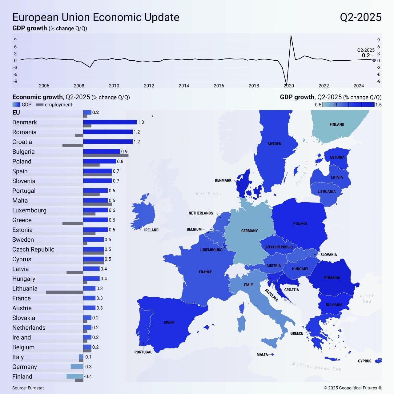 Παρά τη μέτρια ανάπτυξη του δεύτερου τριμήνου που οφείλεται στις καταναλωτικές δαπάνες και τα κονδύλια της ΕΕ, τα οικονομικά θεμέλια της ευρωζώνης παραμένουν εύθραυστα. Η Γερμανία, που κάποτε ήταν η ατμομηχανή της ηπείρου, είναι τώρα η άγκυρά της - επιβραδυνόμενη κάτω από την αδύναμη εξωτερική ζήτηση και τη βιομηχανική παρακμή. Ολόκληρη η ΕΕ αισθάνεται τις επιπτώσεις.