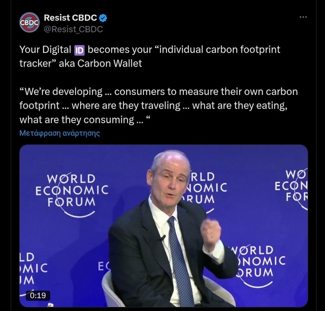 Με την ψηφιακή ταυτότητα “οι καταναλωτές θα μετράνε το προσωπικό τους αποτύπωμα άνθρακα... Πού ταξιδεύουν, πώς ταξιδεύουν, τι τρώνε, τι καταναλώνουν”.