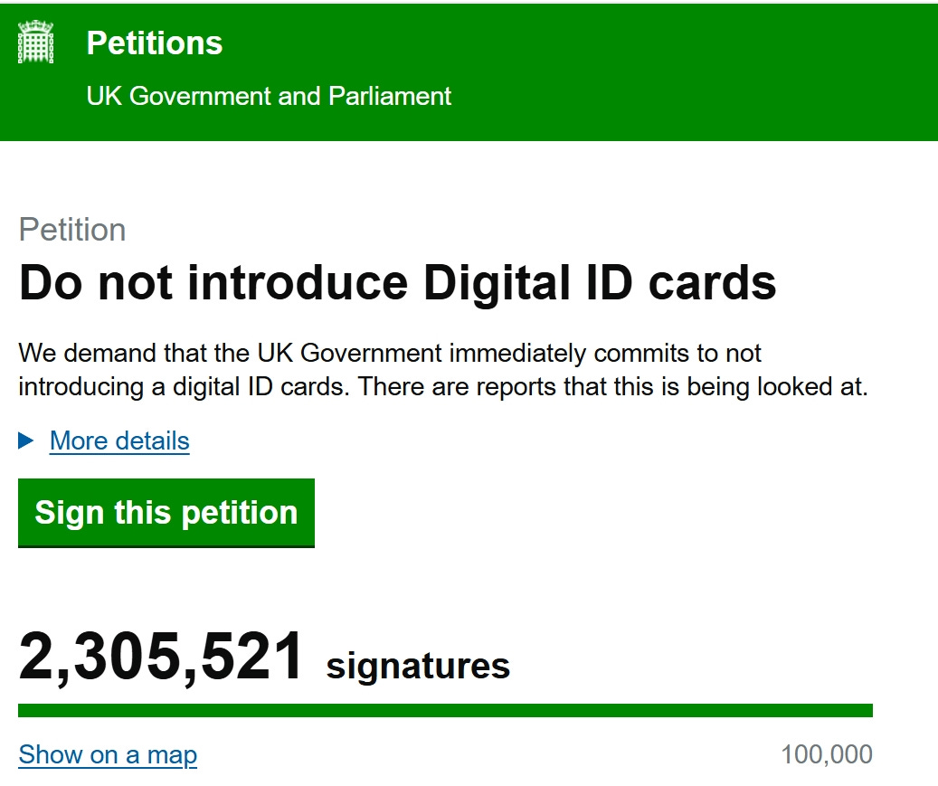 Η αίτηση για να σταματήσουν οι ψηφιακές ταυτότητες έχει πλέον ξεπεράσει κατά πολύ τα 2.5 εκατομμύρια υπογραφές.