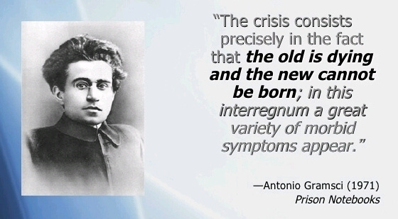 Η κρίση συνίσταται ακριβώς στο γεγονός ότι το παλιό πεθαίνει και το νέο δεν μπορεί να γεννηθεί- σε αυτό το μεσοδιάστημα εμφανίζεται μια μεγάλη ποικιλία νοσηρών συμπτωμάτων”.