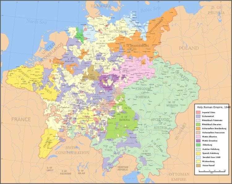 Δυστυχώς, η δολοφονία του Ερρίκου Δ' από «έναν μοναχικό δολοφόνο» το 1610 άφησε ένα κενό εξουσίας και σύντομα οι θρησκευτικοί πόλεμοι έγιναν και πάλι εκτός ελέγχου στην Ευρώπη. Αυτή τη φορά, ωστόσο, συγκεντρώθηκαν στα πιο εύφορα εδάφη της εξαιρετικά κατακερματισμένης Αγίας Ρωμαϊκής Αυτοκρατορίας που καταλάμβανε τότε το μεγαλύτερο μέρος της σημερινής Γερμανίας, της Αυστρίας, της Τσεχικής Δημοκρατίας και της Πολωνίας. Σε αντίθεση με τη σημερινή Γερμανία, η γη που ανατινάχθηκε σε θρησκευτικές συγκρούσεις κατά τη διάρκεια αυτών των σκοτεινών χρόνων κυριαρχούνταν από στενόμυαλους πολέμαρχους πρίγκιπες και δούκες των οποίων η εξουσία εξαρτιόταν από το πόσους μισθοφόρους μπορούσαν να προσλάβουν και γη που μπορούσαν να κλέψουν. Συνολικά, υπήρχαν πάνω από 350 μικροσκοπικά κράτη και πριγκιπάτα μαζί με 2000 δικαιοδοσίες που διαίρεσαν την Αγία Ρωμαϊκή Αυτοκρατορία κάτω από μια σειρά μίνι κυριαρχιών χωρίς καμία αντίληψη ενός μεγαλύτερου συνόλου. [βλ. χάρτη]