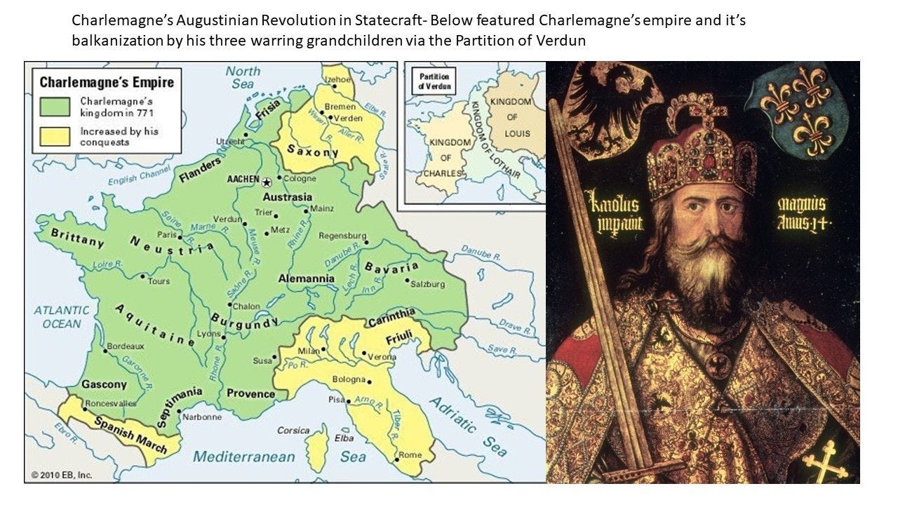 Ακριβώς όπως η εκ νέου ανακάλυψη και εφαρμογή των αρχών του Κομφούκιου ενέπνευσε την αναβίωση του Δρόμου του Μεταξιού από τη δυναστεία των Τανγκ και την ενοποίηση της διαιρεμένης γης το 680 μ.Χ., έτσι και η εκ νέου ανακάλυψη του Πλάτωνα μέσω του Αυγουστινιανού χριστιανικού κινήματος έραψε τους σπόρους για την επανένωση της Ευρώπης υπό τον Φράγκο βασιλιά Πεπίνο τον βραχύ και τον γιο του Καρλομάγνο που τερμάτισε την εποχή των εμπόλεμων κρατών της Ευρώπης και ίδρυσε την Καρολίγγεια Αυτοκρατορία. Αυτή η ιστορία καλύπτεται εκτενώς από τον καθηγητή Pierre Beaudry στην Οικουμενική Αρχή του Καρλομάγνου.