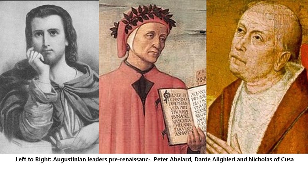 Ο αγώνας του Αβελάρδου συνεχίστηκε από τον Δάντη Αλιγκιέρι (1264-1321), ο οποίος έκανε πολλά για να αναβιώσει τη θέση του Αγίου Αυγουστίνου στο έργο του De Monarchia που δημοσιεύτηκε το 1312 μ.Χ. Οι Αυγουστινιανοί Χριστιανοί ηγέτες γύρω από τον Νικόλαο της Κούζας (1401-1464) οργάνωσαν την ενοποίηση της εκκλησίας κατά τη διάρκεια της Συνόδου της Φλωρεντίας το 1438 (και πάλι, σύντομα σαμποτάρεται με την καταστροφή της Κωνσταντινούπολης το 1452) και πάλι οι Αυγουστινιανοί Χριστιανοί ανασυντάχθηκαν και έθεσαν τις βάσεις για τη Χρυσή Αναγέννηση.