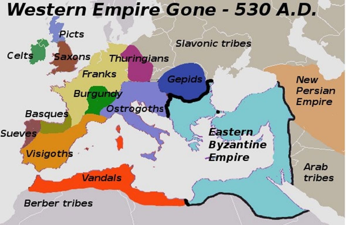 Ολόκληρη η επικράτεια της πρώην δυτικής Ρωμαϊκής Αυτοκρατορίας είχε καταστραφεί από εδαφικούς πολέμαρχους που μάχονταν για εδάφη με παρόμοιο μοτίβο που βίωσε η Κίνα κατά τη διάρκεια της σκοτεινής εποχής των 480 ετών που ήρθε στον απόηχο της πτώσης της δυναστείας των Χαν το 200 μ.Χ.
