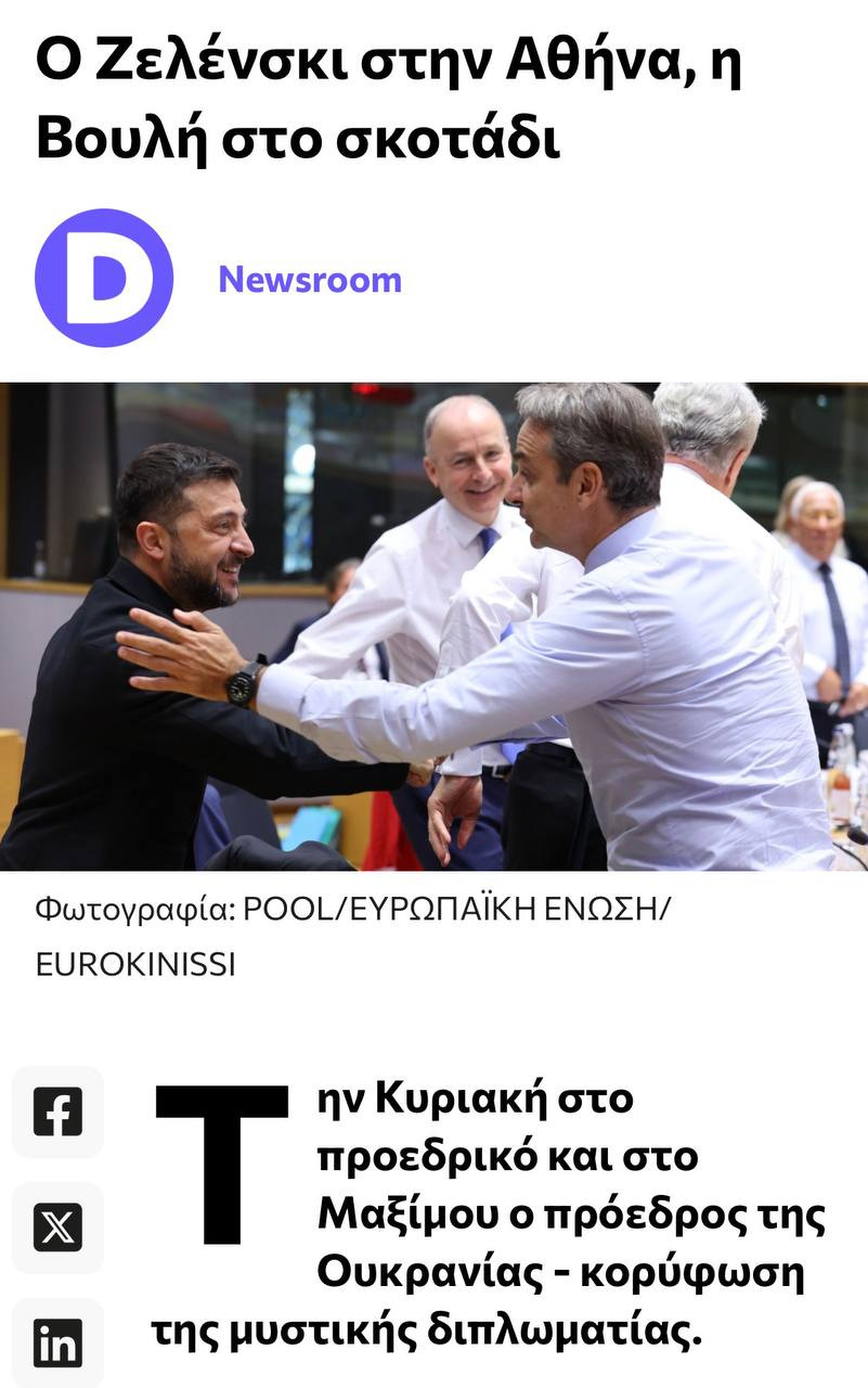 Εν κρυπτώ και μακριά από τα φώτα θα γίνει η συν-ουσία των δύο πλέον διεφθαρμένων πολιτικών ηγετών του πλανήτη. Το θύμα θα είναι η Ελλάδα μας που θα πλήρωσε δισεκατομμύρια για την άμυνα της χώρας για να τα δίνει ο εκλεγμένος απατεώνας στους Ουκροναζί για να σκοτώνουν Ρώσους σε ένα πόλεμο που έχει ουσιαστικά τελειώσει και μόνο η διαφθορά κάποιων Ευρωπαίων εκλεγμένων και μη εκλεγμένων ηγετών διατηρεί την αιματοχυσία. Πιάσαμε πάτο!!