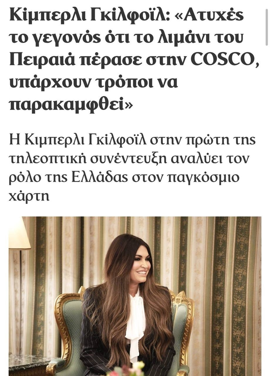 Η εν λόγω κυρία θέλει να αθετήσει η Ελλάδα το συμβόλαιο της με την Κίνα για το λιμάνι του Πειραιά. Δεν γνωρίζω τι “κόλπα” θα προτείνει, αλλά σε ποιότητα δεν θα διαφέρει από την προτεινόμενη κλοπή των Ρωσικών αποθεμάτων στο Euroclear. Θα σημαίνει αναξιοπιστία στην τήρηση συμβολαίων της Ελλάδας και θα αποτρέψει οποιαδήποτε νέα επένδυση από χώρες του Παγκόσμιου Νότου. Σκάνδαλο παγκόσμιας εμβέλειας θα είναι με επιπτώσεις από την Κίνα, χωρίς αμφιβολία.