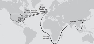 Εν τω μεταξύ, η Βρετανία αγόραζε το 80% του βαμβακιού που παρήγαγαν τα δουλοκτητικά κράτη των ΗΠΑ, ενθαρρύνοντας τον εθισμό στην εργασία των σκλάβων, σε καμία περίπτωση από το σύστημα εξάρτησης που επέβλεπε η Παγκόσμια Τράπεζα και το ΔΝΤ στις ημέρες της παγκοσμιοποίησης.