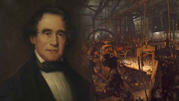 «Δύο συστήματα είναι μπροστά στον κόσμο. Το ένα αποβλέπει στην αύξηση της αναλογίας των ατόμων και του κεφαλαίου που ασχολούνται με το εμπόριο και τις μεταφορές, και επομένως στη μείωση της αναλογίας που ασχολείται με την παραγωγή εμπορευμάτων με τα οποία θα συναλλάσσεται, με αναγκαστικά μειωμένη απόδοση στην εργασία όλων. Ενώ η άλλη αποβλέπει στην αύξηση του ποσοστού που ασχολείται με την εργασία της παραγωγής και στη μείωση του ποσοστού που ασχολείται με το εμπόριο και τις μεταφορές, με αυξημένη απόδοση σε όλους, δίνοντας στον εργάτη καλούς μισθούς και στον ιδιοκτήτη του κεφαλαίου καλά κέρδη.