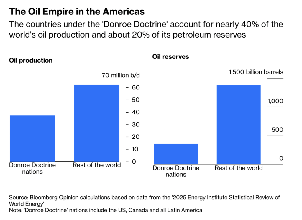 Ο Javier Blas γράφει στο Bloomberg ότι οι ΗΠΑ ασκούν έλεγχο σε όλη την παραγωγή πετρελαίου χωρών -από τον Καναδά έως την Αργεντινή- που ζουν σύμφωνα με το «Δόγμα Donroe». Αυτό είναι σχεδόν το 40 τοις εκατό της παγκόσμιας παραγωγής πετρελαίου.