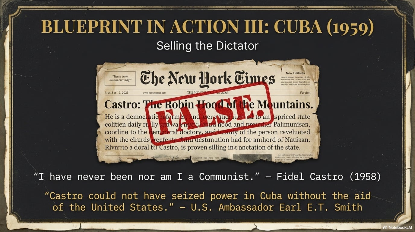 Σκόπιμη εξαπάτηση: Παρά τη γνώση αυτή, βασικοί αξιωματούχοι του Στέιτ Ντιπάρτμεντ και δημοσιογράφοι με επιρροή όπως ο Χέρμπερτ Μάθιους των New York Times αρνήθηκαν δημόσια τους κομμουνιστικούς δεσμούς του Κάστρο, επιτρέποντας την άνοδό του στην εξουσία.