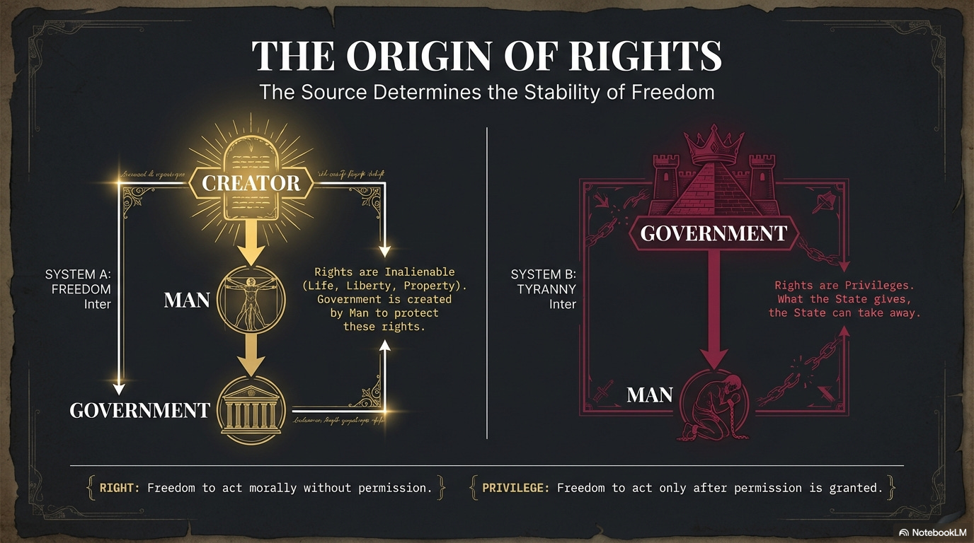 Ένας Δημιουργός: Τα δικαιώματα είναι «αναφαίρετα» δώρα από τον Θεό (Ζωή, Ελευθερία, Ιδιοκτησία) και δεν μπορούν να αφαιρεθούν νόμιμα από τον άνθρωπο ή την κυβέρνηση. Αυτή είναι η άποψη των ιδρυτών της Αμερικής, όπως εκφράζεται στη Διακήρυξη της Ανεξαρτησίας.