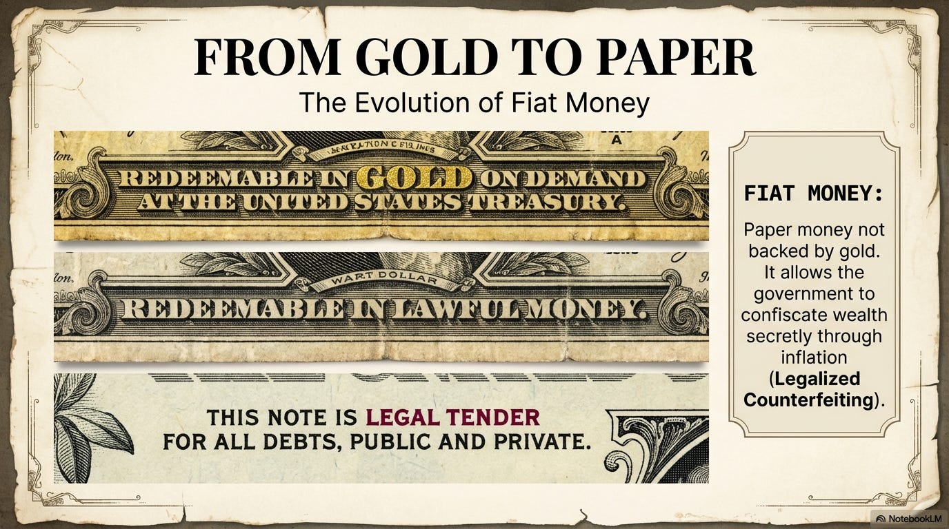 Ο ρόλος του χρυσού: Ο κανόνας χρυσού παρουσιάζεται ως ο πρωταρχικός έλεγχος της ικανότητας μιας κυβέρνησης να φουσκώνει, καθώς απαιτεί το χάρτινο νόμισμα να μπορεί να εξαργυρωθεί σε ένα πεπερασμένο εμπόρευμα. Ο στόχος της συνωμοσίας είναι επομένως να αντικαταστήσει τον κανόνα του χρυσού με το Fiat Money - χαρτονόμισμα χωρίς υποστήριξη, το οποίο μπορεί να εκτυπωθεί χωρίς όριο. Το εκτελεστικό διάταγμα του Προέδρου Φράνκλιν Ρούσβελτ του 1933 για την ανάκληση του ιδιωτικού χρυσού παρουσιάζεται ως βασικό βήμα σε αυτή τη διαδικασία.