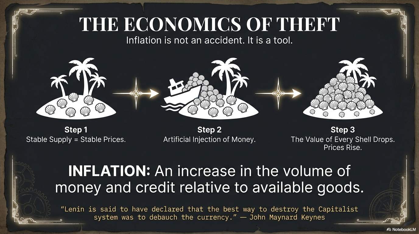 Σκοπός του πληθωρισμού: Επικαλούμενο τον John Maynard Keynes, το βιβλίο υποστηρίζει ότι ο πληθωρισμός είναι το «πιο σίγουρο μέσο για την ανατροπή της υπάρχουσας βάσης της κοινωνίας». Σύμφωνα με ένα απόσπασμα που αποδίδεται στον Λένιν, σκοπός του είναι να «καταστρέψει το καπιταλιστικό σύστημα». Ο πληθωρισμός λειτουργεί ως μυστικός φόρος, επιτρέποντας στις κυβερνήσεις να κατάσχουν τον πλούτο, να φτωχοποιούν τη μεσαία τάξη και να πλουτίζουν λίγους εκλεκτούς.