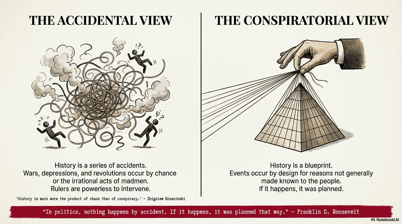 Η συνωμοτική άποψη της ιστορίας: Αυτή είναι η άποψη που υποστηρίζει ο συγγραφέας, υποστηρίζοντας ότι τα μεγάλα γεγονότα προκύπτουν από τον σκόπιμο σχεδιασμό σχεδιαστών που εργάζονται μυστικά. Αυτή η προοπτική υποστηρίζεται από ένα απόσπασμα που αποδίδεται στον Franklin D. Roosevelt: «Στην πολιτική, τίποτα δεν συμβαίνει τυχαία. Αν συμβεί, σχεδιάστηκε έτσι».