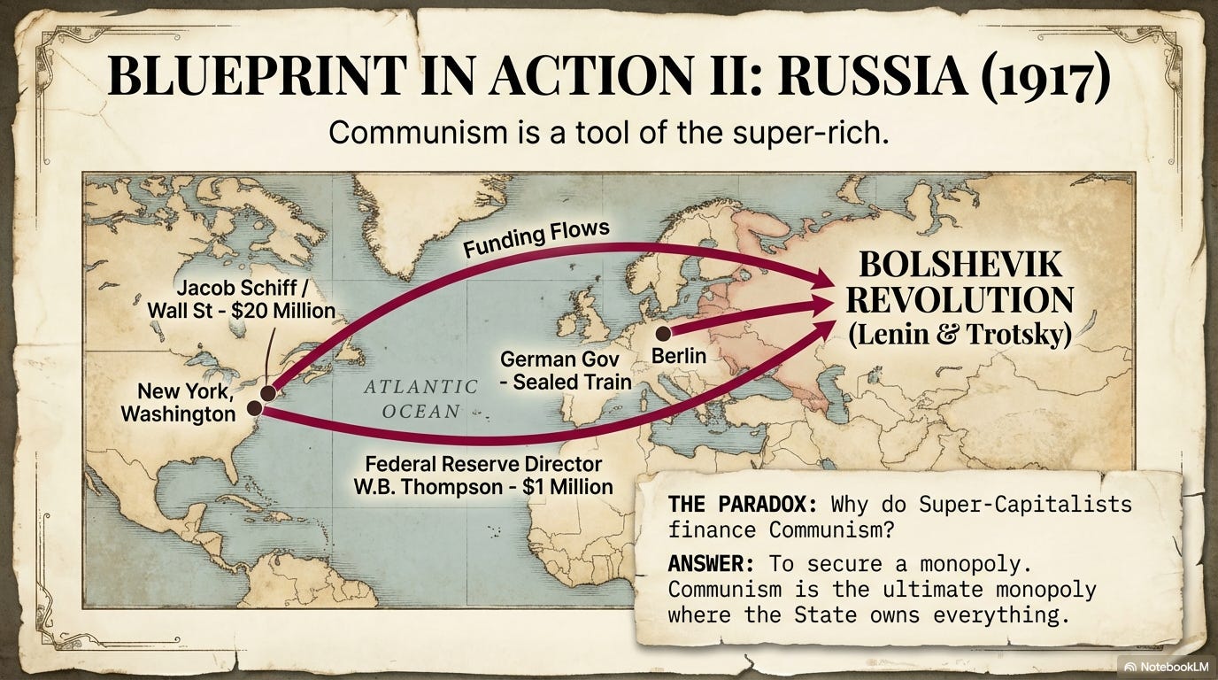 Ξένη χρηματοδότηση: Οι Μπολσεβίκοι χρηματοδοτήθηκαν από διεθνείς τραπεζίτες, συμπεριλαμβανομένων των Jacob Schiff της Kuhn, Loeb & Co. στη Νέα Υόρκη (20 εκατομμύρια δολάρια), συμφερόντων JP Morgan και Rockefeller και Γερμανών τραπεζιτών. Πρόσθετη υποστήριξη προήλθε από τη μη βίαιη Βρετανική Φαβιανή Εταιρεία.