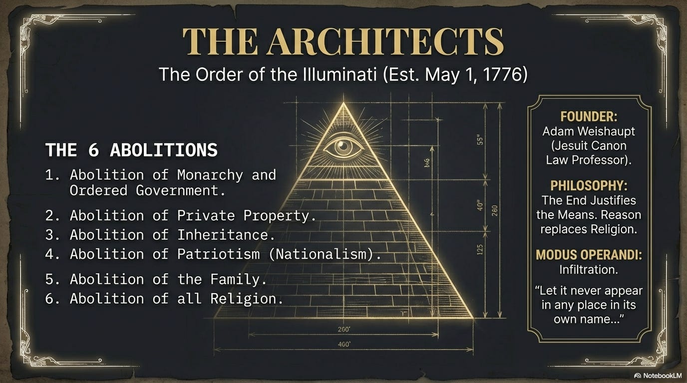 Ίδρυση: Το Τάγμα των Illuminati ιδρύθηκε την 1η Μαΐου 1776 από τον Adam Weishaupt, καθηγητή στο Πανεπιστήμιο Ingolstadt στη Βαυαρία.