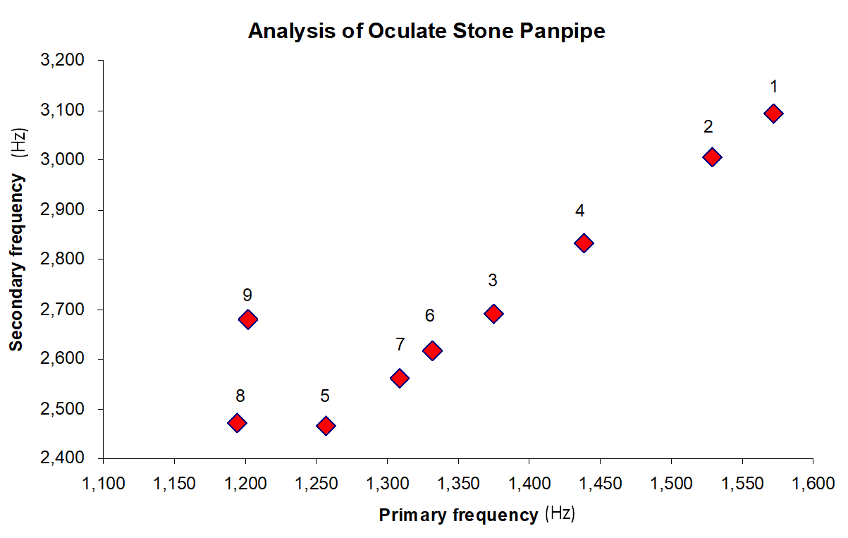 Μια πιο αξιοσημείωτη γραμμική σχέση μεταξύ πρωτευόντων και δευτερευόντων τόνων είναι εμφανής για τα πρώτα 7 αντηχεία. κάτι που πρέπει να σκόπευε ο κατασκευαστής. Βλέπουμε το κατεστραμμένο αντηχείο #8 να κάθεται λίγο αμήχανα στην αριστερή γωνία, μαζί με το παράξενο αντηχείο #9 – κάτι που θα μπορούσε να υποδηλώνει ότι και αυτό ήταν κατεστραμμένο.