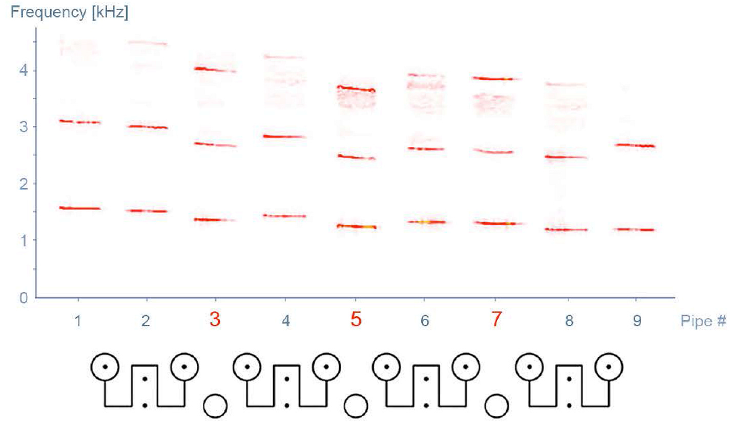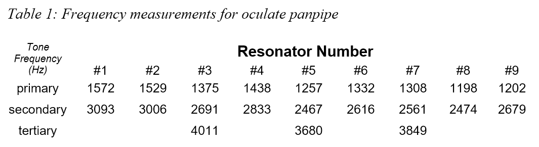 Οι ελάχιστες και μέγιστες πρωτεύουσες συχνότητες για τους 7 συντονιστές ήταν 1.257 Hz και 1.572 Hz αντίστοιχα, δίνοντας ένα εύρος 315 Hz, το οποίο είναι διακύμανση περίπου 20% στο συνολικό βήμα σε όλα τα αντηχεία.
