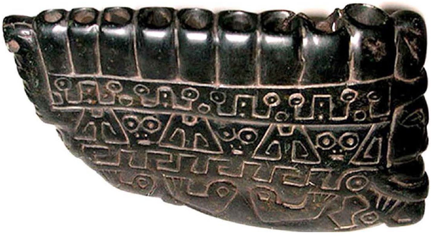 Αυτές οι πέντε μαύρες πέτρινες φλογέρες είναι ίσως τα πιο εξελιγμένα ψυχοακουστικά όργανα που έχουν ανακαλυφθεί ποτέ, και παρά το γεγονός ότι έχουν υποστεί κάποιες μικρές ζημιές, μπορούν ακόμα να παιχτούν με βαθύ αποτέλεσμα. Αυτοί οι παράξενα σχεδιασμένοι πέτρινοι σωλήνες έχουν αντηχεία που σχηματίζονται από διασυνδεόμενες οπές σε αντίθεση με τους τυπικούς ανοιχτούς σωλήνες των Άνδεων που χρησιμοποιούνται σήμερα. Στην πραγματικότητα, και οι πέντε από αυτούς τους μαύρους πέτρινους σωλήνες έχουν διαμορφωθεί με μικρές οπές που συνδέουν γειτονικά αντηχεία στο κάτω μέρος του βάθους διάτρησης 2", επιτρέποντας στον αέρα που διοχετεύεται σε έναν σωλήνα να εξέρχεται από κάθε έναν από τους δύο παρακείμενους σωλήνες. Είναι ενδιαφέρον ότι οι τονικές προόδους των panpipes δεν είναι ανοδικές αλλά κλιμακωτές έτσι ώστε κάθε τόνος να γειτνιάζει με δύο υψηλότερους τόνους ή δύο χαμηλότερους τόνους που λαμβάνουν ροή αέρα από τον κεντρικό τόνο που παίζεται. Το περίεργο αποτέλεσμα των κουρδισμάτων των συνδεδεμένων διόδων αέρα είναι η ταυτόχρονη παραγωγή τριών αρμονικών τόνων που παρασύρουν τη συνείδηση.