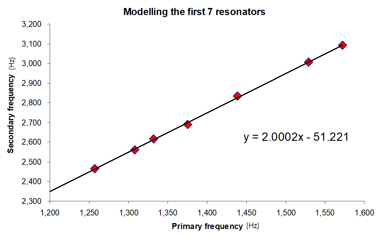 ΟΚΤΑΒΕΣ - απλές και απλές: οι δευτερεύουσες συχνότητες για τα αντηχεία #1 έως #7 είναι διπλάσιες από τη συχνότητα του πρωτεύοντος. Το γεγονός αυτό συμβολίζεται με τον συντελεστή 2,0002, με τυπικό σφάλμα 0,020 (p<0,001). Οι κατασκευαστικές ανοχές αυτού του σωλήνα είναι εκπληκτικές. Εδώ βλέπουμε 7 αντηχεία, όλα με ελαφρώς διαφορετικές πρωτεύουσες συχνότητες, αλλά όλα κατασκευασμένα προσεκτικά για να παράγουν 7 οκτάβες, όλα ελαφρώς διαφορετικά. Τι γίνεται όμως με αυτόν τον αριθμό -51.221 Hz; Αυτή είναι μια σταθερά παλινδρόμησης που μπορεί να αγνοηθεί, καθώς η σχετική τιμή πιθανότητας είναι απλώς p=0,133 – πράγμα που σημαίνει ότι δεν είναι στατιστικά σημαντική στο καθολικά αποδεκτό επίπεδο εμπιστοσύνης 95%.