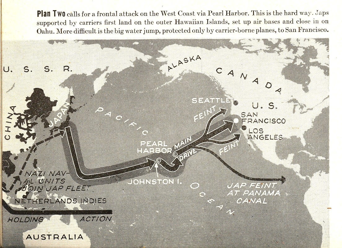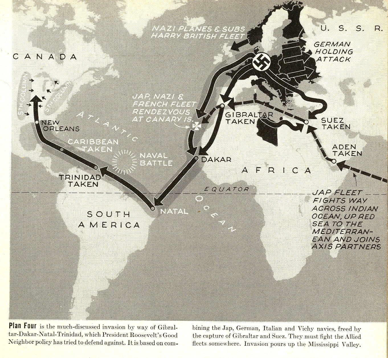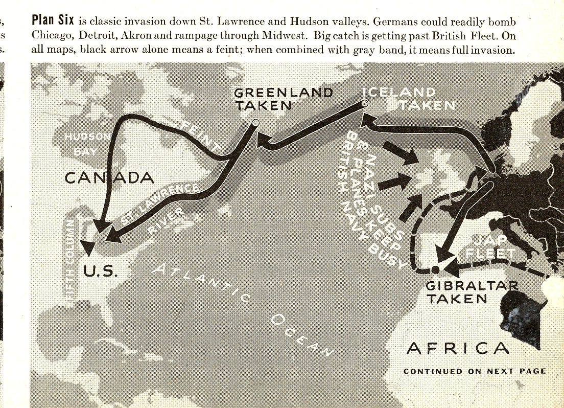 Αν και τα βρετανικά σχέδια για την υποστήριξη του ναζιστικού τέρατος του Φρανκενστάιν αντιμετώπισαν οπισθοδρόμηση με την απόφαση να εκδιώξουν τον φιλοναζί βασιλιά Γεώργιο Η', ακολουθούμενο από τον φιλοναζί πρωθυπουργό Νέβιλ Τσάμπερλεν, το σχέδιο εισβολής στις ΗΠΑ όπως περιγράφεται στο Αμυντικό Σχέδιο 1 τροποποιήθηκε ελαφρώς, με τους Ναζί και τους Ιάπωνες να συνωμοτούν για να εισβάλουν στις ΗΠΑ μέσω των σχεδίων ένα-έξι. όπως περιγράφεται σε μια έκδοση της 2ας Μαρτίου 1942 του περιοδικού Life. (τα σχέδια 2, 4 και 6 παρουσιάζονται παρακάτω):