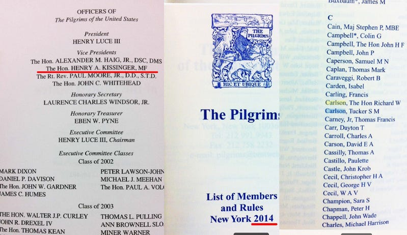 Το αστέρι του Κίσινγκερ ανέτειλε γρήγορα υπό την περιποίηση του Νέλσον και του Ντέιβιντ Ροκφέλερ, όπου έγινε μέλος της Διευθύνουσας Επιτροπής της Λέσχης Μπίλντερμπεργκ ΠΡΙΝ γίνει υπουργός Εξωτερικών υπό τον Ρίτσαρντ Νίξον. Καθ' όλη τη διάρκεια της καριέρας του, ο Κίσινγκερ ήταν πάντα μέλος της Αγγλοαμερικανικής Εταιρείας Προσκυνητών, και έγινε Αντιπρόεδρός της (μαζί με τον Πολ Βόλκερ) από το 2002-2019. [1]