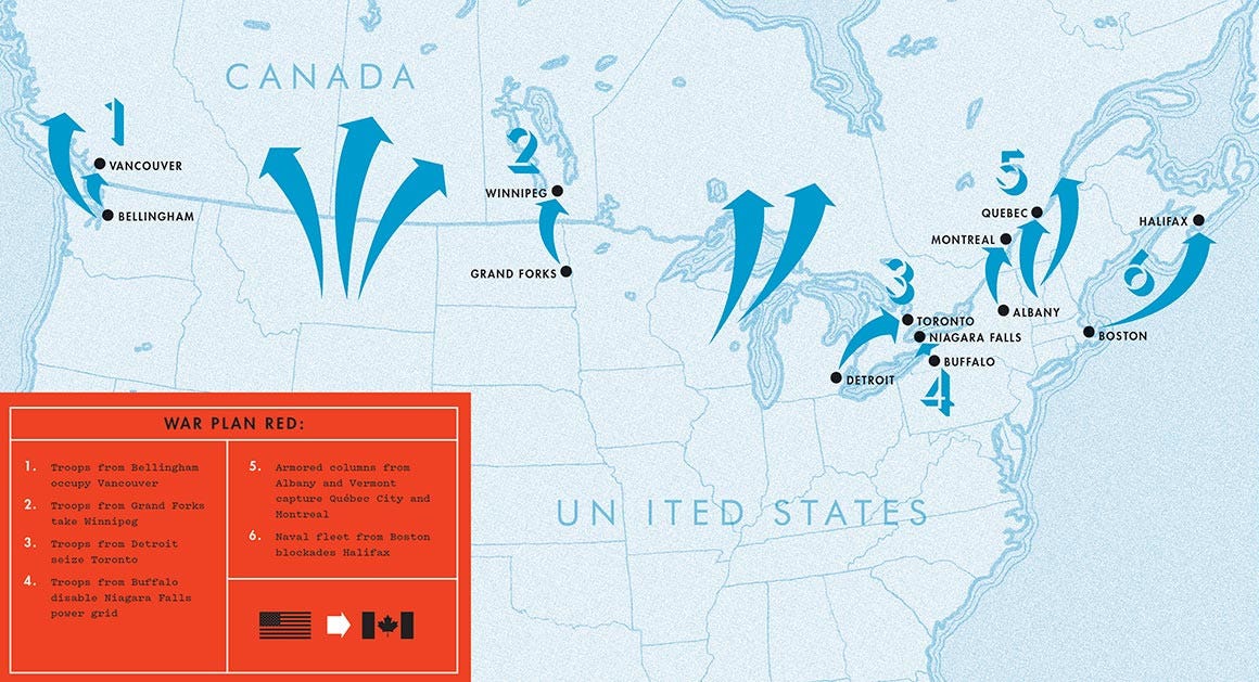 Πολλοί ιστορικοί χρησιμοποιούν το «Κόκκινο Πολεμικό Σχέδιο» ως αποδεικτικό στοιχείο για να αποδείξουν ότι οι Ηνωμένες Πολιτείες είχαν επιθετικές αυτοκρατορικές φιλοδοξίες να καταλάβουν τον Καναδά για σχεδόν έναν αιώνα. Το γεγονός είναι ότι το Κόκκινο Πολεμικό Σχέδιο συντάχθηκε στην πραγματικότητα ως ΑΠΑΝΤΗΣΗ στο ήδη υπάρχον σχέδιο Defense Scheme 1, που συντάχθηκε από τη Βρετανική Αυτοκρατορία το 1921 για να εισβάλει στις ΗΠΑ από τον Καναδά στο πλαίσιο οποιουδήποτε μελλοντικού πολέμου ΗΠΑ εναντίον Βρετανίας.