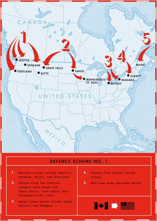 Αν και συνήθως αντιμετωπίζεται ως ένα απλό πολεμικό σχέδιο Καναδά εναντίον ΗΠΑ, το γεγονός ήταν ότι οι Βρετανοί κατασκεύασαν το Αμυντικό Σχέδιο 1 ως μέρος ενός πολύ μεγαλύτερου προγράμματος που περιελάμβανε ιαπωνικές επιθέσεις στη Δυτική Ακτή των ΗΠΑ και βρετανικές επιδρομές στις ΗΠΑ μέσω του Μεξικού από το νότο.