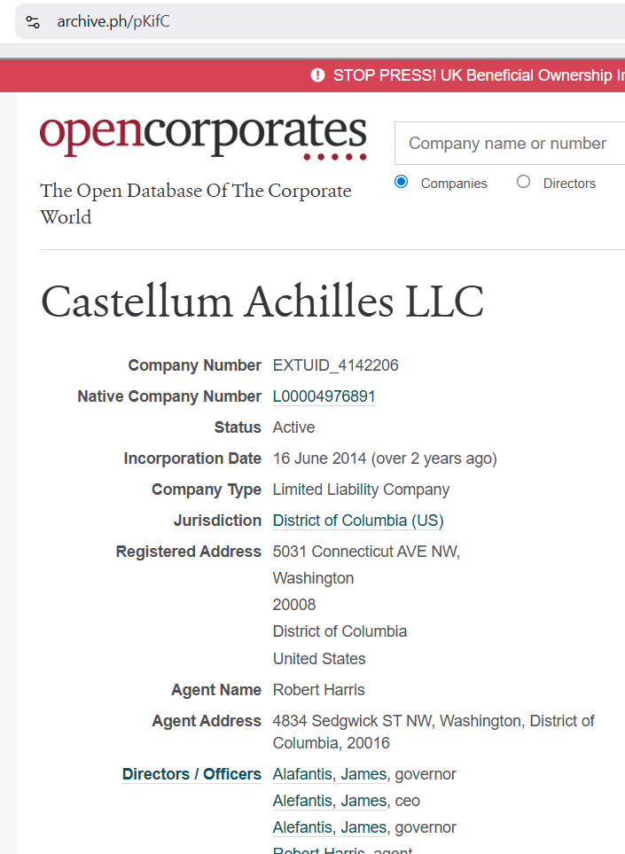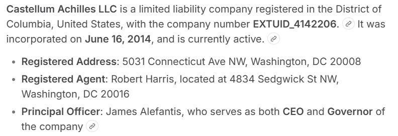 Όπως αναφέρθηκε προηγουμένως, η CASTELLUM ACHILLES LLC είναι η εταιρεία που κατέχει ο Αλεφάντης, στην οποία ανήκε ο Πήγασος. Αυτή η εταιρεία είναι σχεδόν 12 ετών. Αυτό που δεν σας είπα είναι ότι ο Τζέιμς είναι ιδιοκτήτης μιας άλλης οντότητας που ονομάζεται CHRISTOPHER ACHILLES LLC. Αυτό είναι πάνω από 20 ετών.