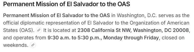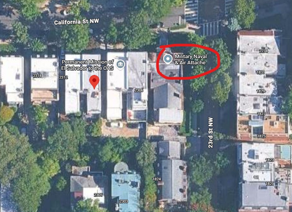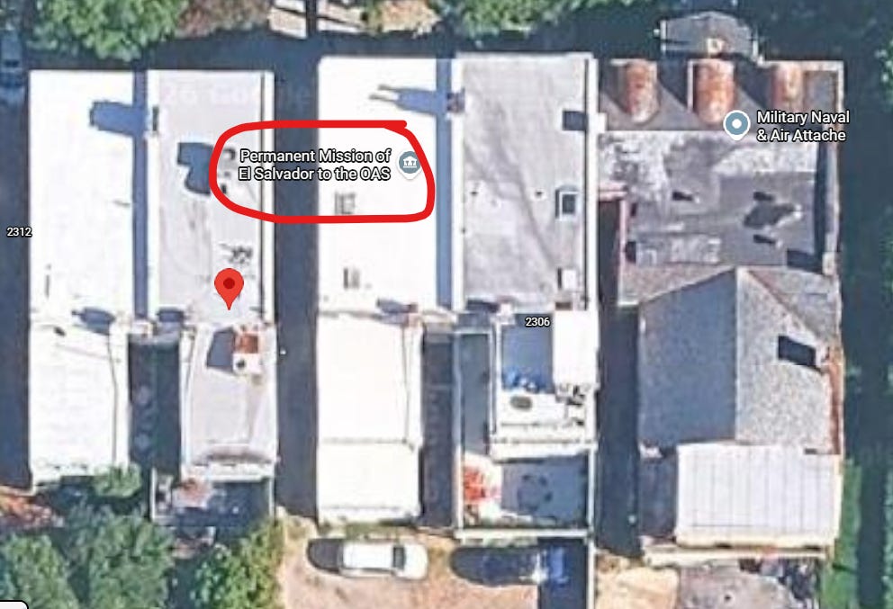 Το άλλο κτίριο, αυτό που βρίσκεται ακριβώς δίπλα στο σπίτι που αλλάζει συνεχώς χέρια, η Μόνιμη Αντιπροσωπεία του Ελ Σαλβαδόρ στον ΟΑΚ, χρησιμεύει ως η επίσημη διπλωματική εκπροσώπηση του Ελ Σαλβαδόρ στον Οργανισμό Αμερικανικών Κρατών. Ο ιστότοπός τους δεν λειτουργεί αυτή τη στιγμή,