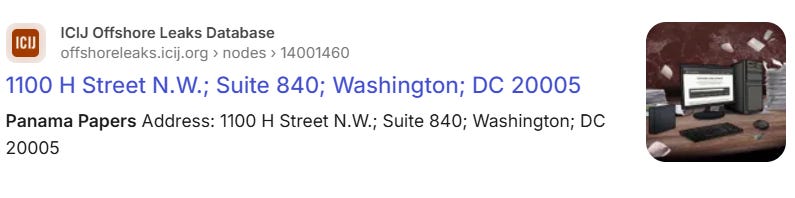 Οι ερευνητές που έψαξαν έγγραφα αποκάλυψαν μια πολύ ενδιαφέρουσα διεύθυνση θαμμένη μέσα στη χωματερή δεδομένων. Ωστόσο, οι ερευνητές των Panama Paper δεν ήξεραν τι αποκάλυψαν, οπότε θα τους πω πόσο μεγάλο εύρημα είναι αυτό. Αυτή η διεύθυνση ήταν 1100 H STREET, Suite 840, Washington, DC.