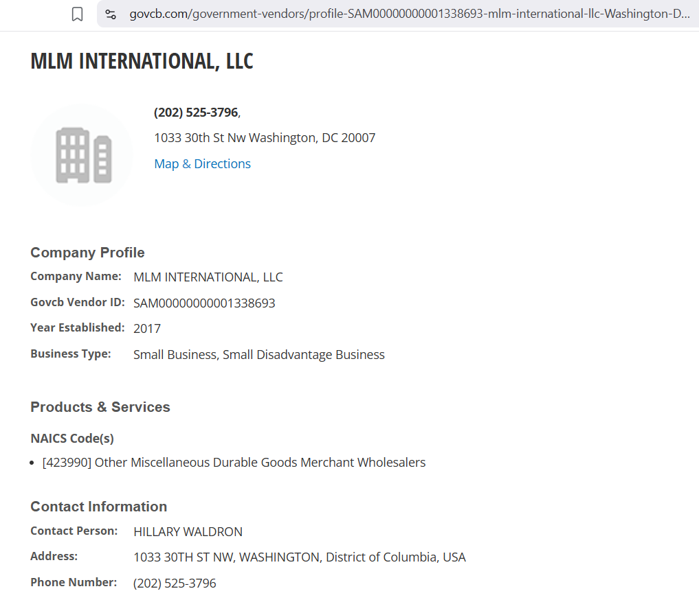 Το MLM είναι ενεργό από το 2007. Είναι προμηθευτής της κυβέρνησης των ΗΠΑ. Ο υπεύθυνος επικοινωνίας σε αυτήν την εταιρεία αναφέρεται ως HILLARY WALDRON.